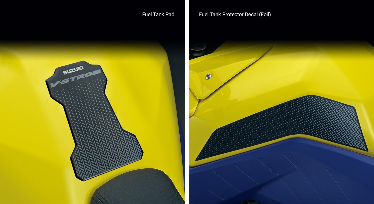 - The “DE” decals on the sides of the cowling pieces in front of the engine reflect the image of the competition numbers used on motocross and other competition motorcycles, while the “V-STROM” logo continues the motif introduced with the V-STROM 1050DE.