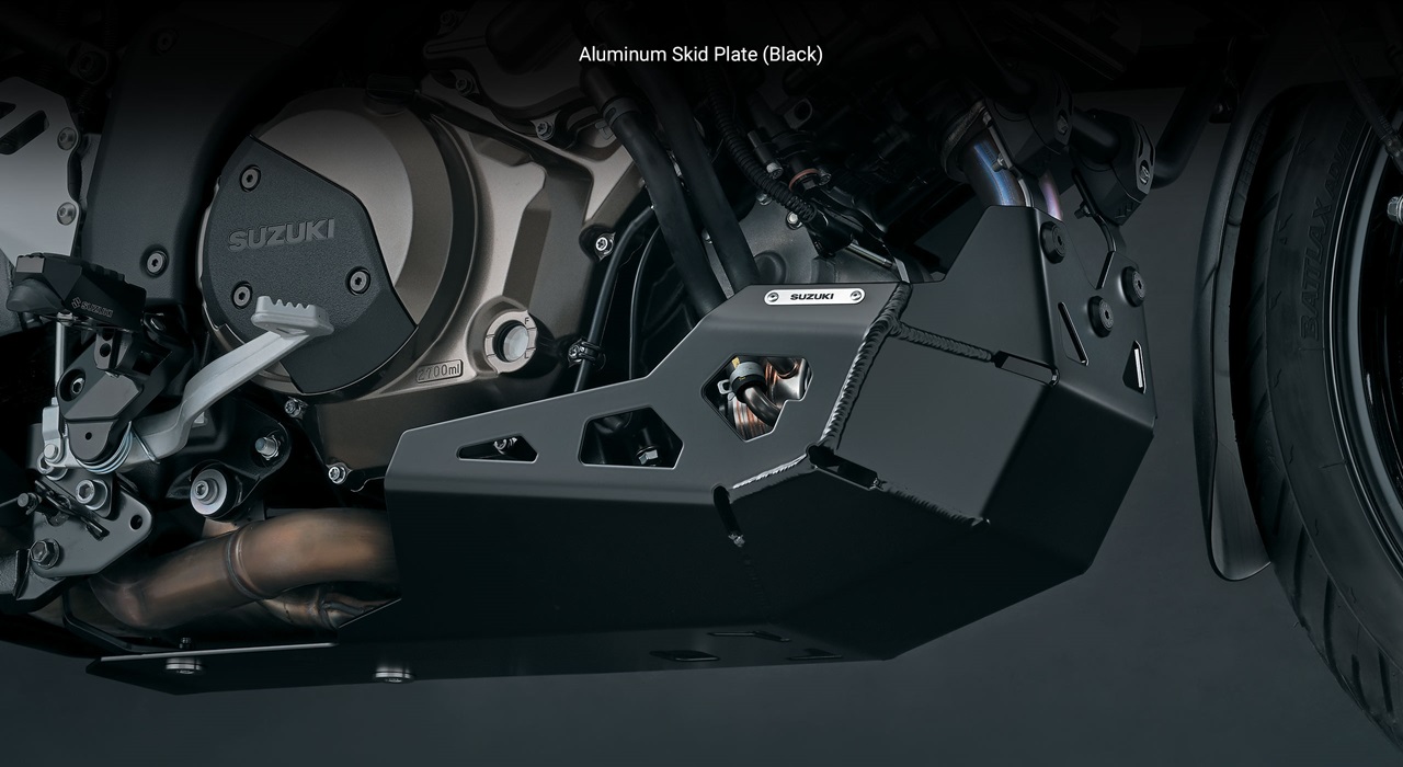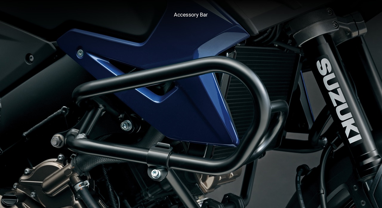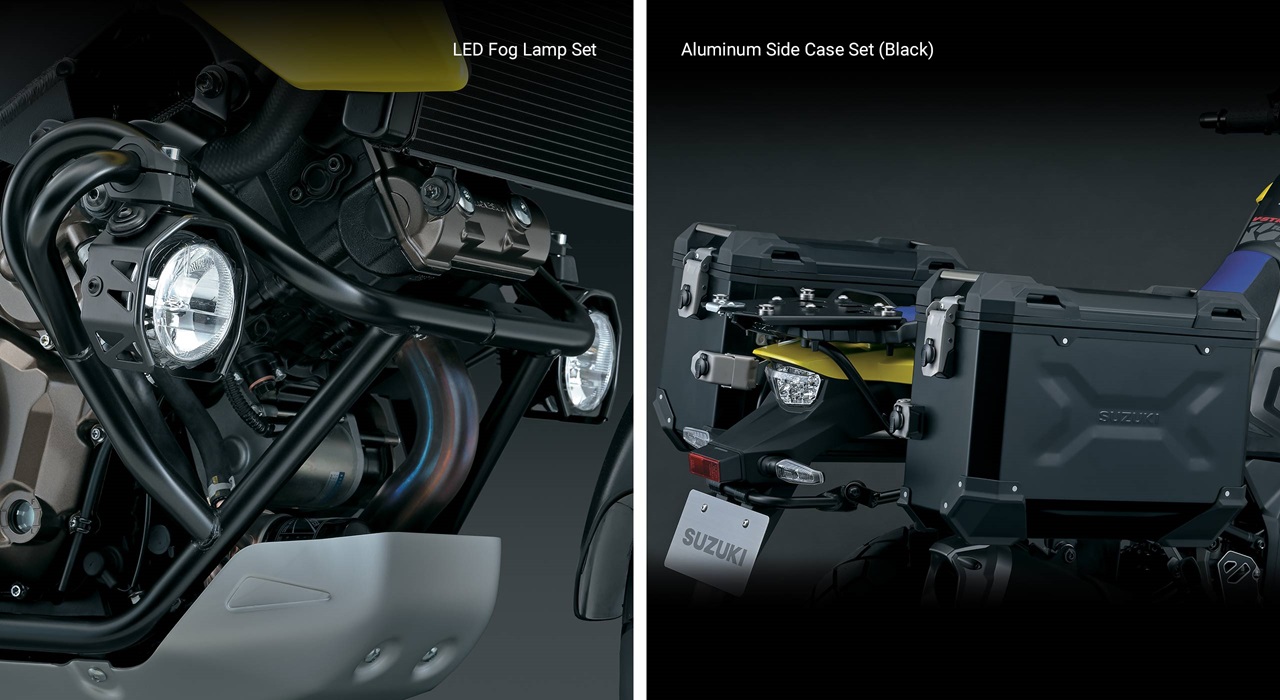 A wide variety of Genuine Suzuki Accessories for V-STROM 1050 owners are available, including aluminum or plastic luggage, heated grips, low-profile seats, accessory bar, auxiliary lights, tank bags, body & chassis protectors, graphics kits & rim decals, and a large selection of Suzuki logo apparel.