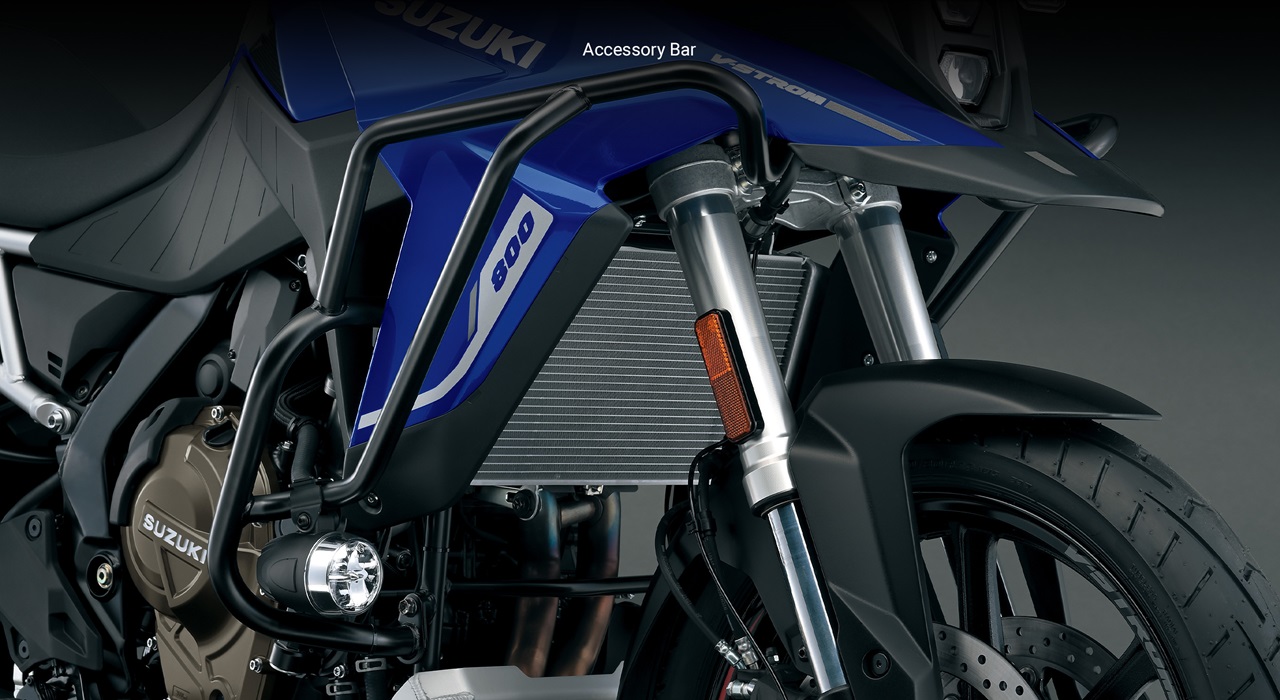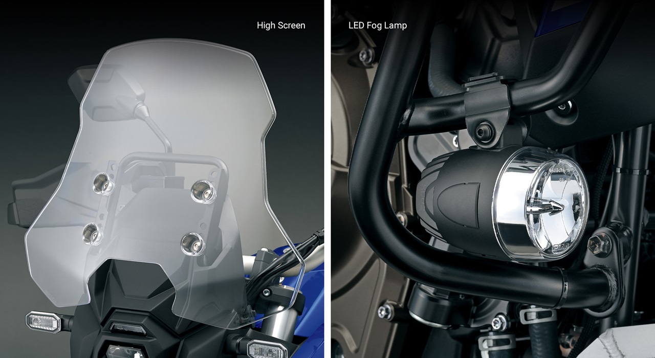 Genuine Suzuki Accessories for the V-STROM 800 include side and top cases, engine guards, center stand, low- and high-profile seats, heated hand grips, fog lamps, and more.