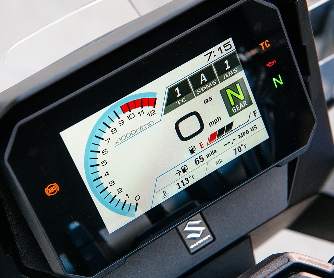The V-STROM 800’s instrument panel uses a full-color, 5-inch, TFT LCD screen.