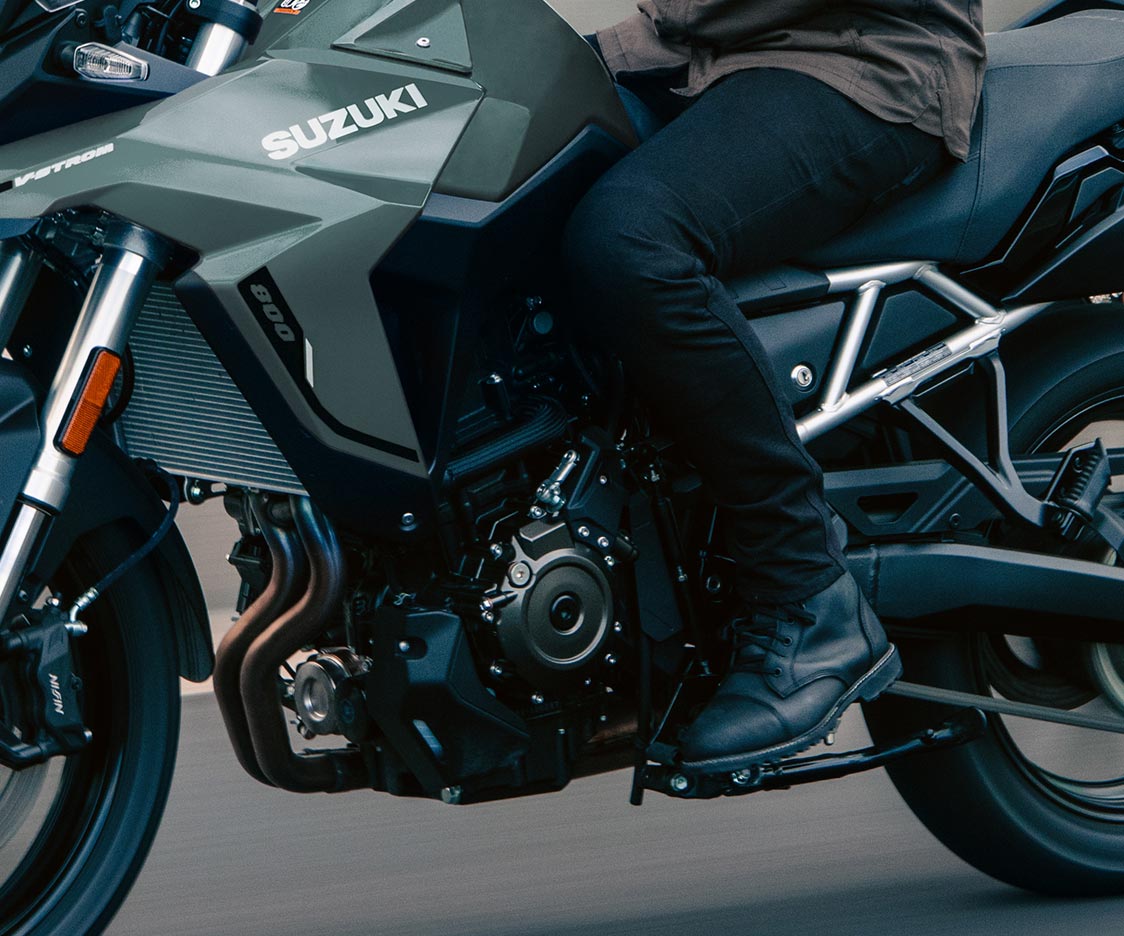 The V-STROM 800’s precise shift linkage helps the rider easily and quickly select the ideal gear for the riding conditions.