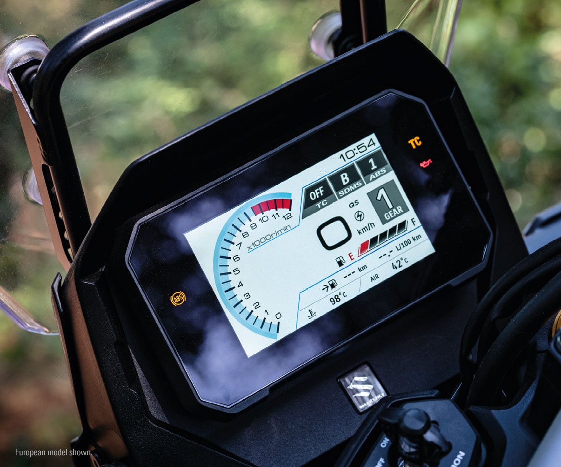The V-STROM 800DE’s instrument panel uses a full-color, 5-inch, TFT screen.