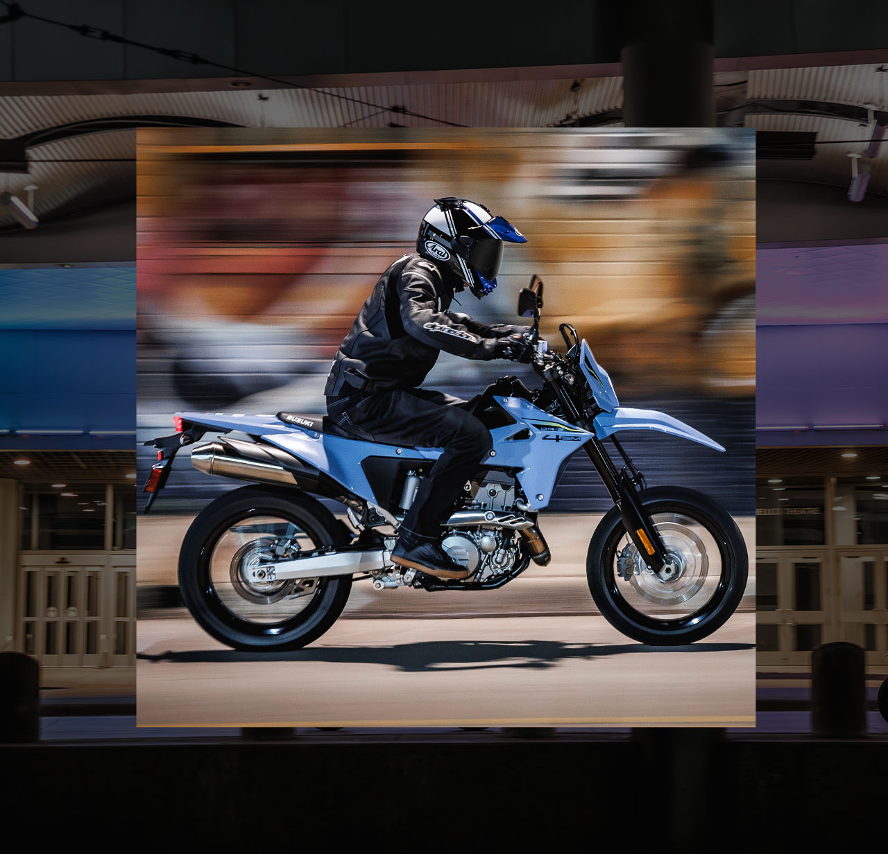 The fun has just begun. The legendary DR-Z4SM is back to dominate the street, the pavement, and any other road beneath its wheels. Earn attention at every turn of the racetrack or demand to be noticed at every corner of the city. With performance that defies and style that delivers, ride to the rhythm of your own beat on this Suzuki SuperMoto.