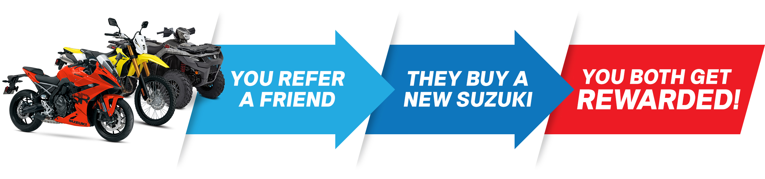 Own a 2016 or newer Suzuki? For a limited time, Suzuki will give you and your friend Suzuki Bucks rewards vouchers for participating in our referral program.