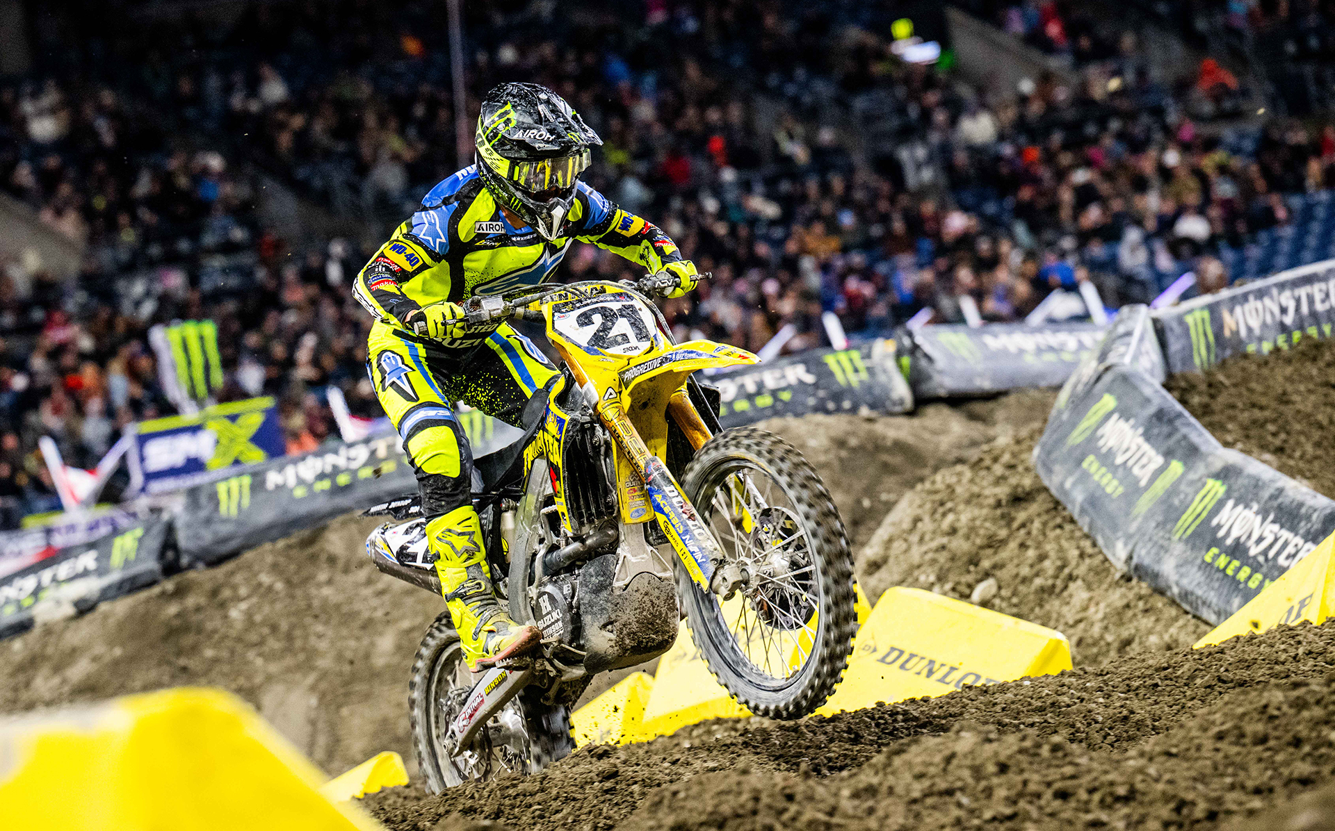 Ken Roczen (94) demonstrated the breadth of his talent in Seattle. After delivering a runaway main event win the weekend before on the hardpack of Glendale, Arizona, Roczen and his Suzuki RM-Z450 earned an uncontested victory in his heat race at the Seattle Supercross. In the Seattle main event, Roczen crossed the holeshot stripe in sixth place then launched a drive to the front; by lap three he had secured third place. As the top three riders pulled clear of the field, Roczen put in surges to get into position to attempt another pass. Late in the race, another rider jumped into Roczen in the sand section and both racers went down. It was the end of Roczen’s hope of a Seattle podium; he crossed the line inside the top ten and remains inside the top 3 in the championship standings.