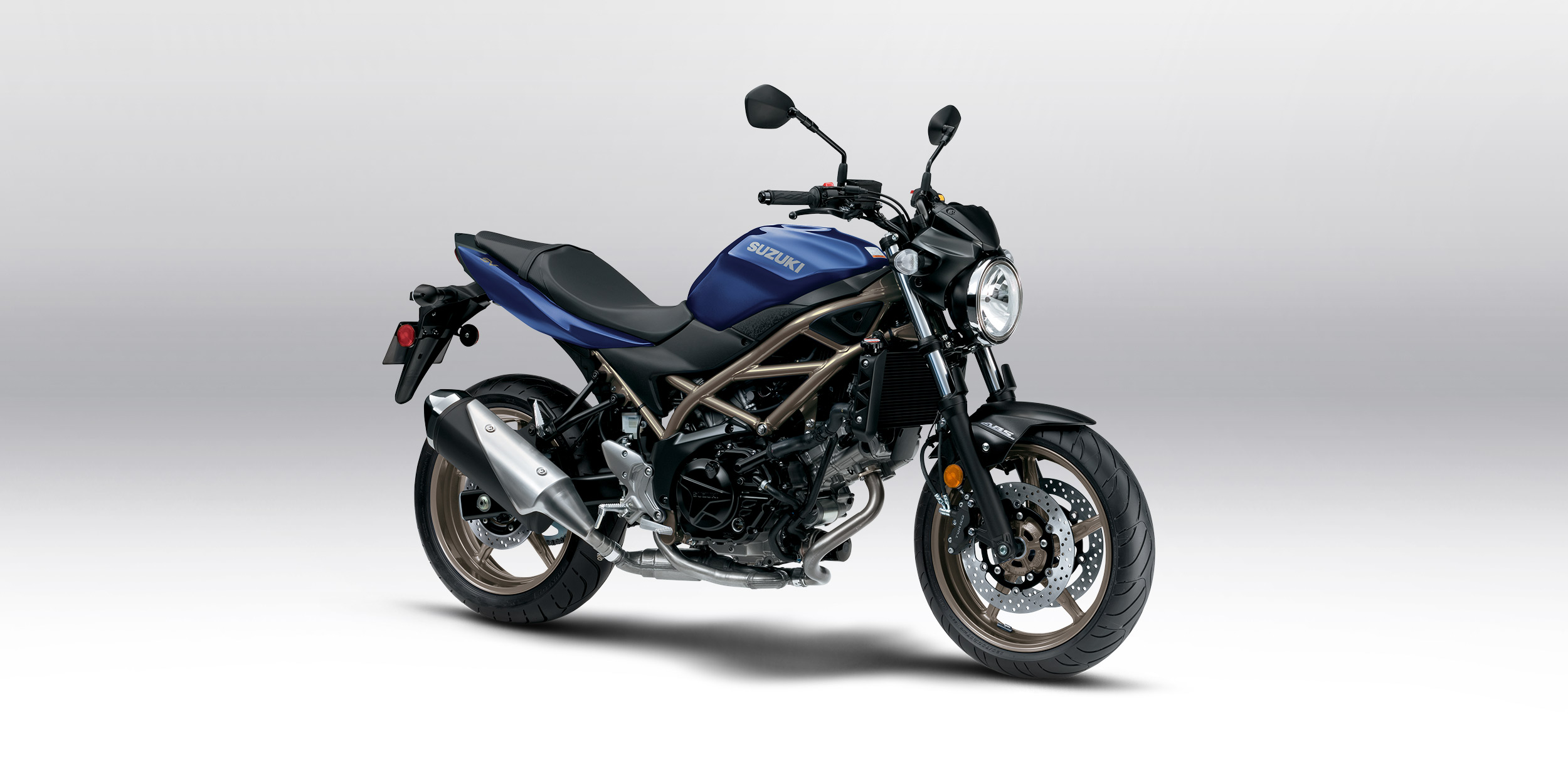 The 2023 SV650 ABS’s Metallic Reflective Blue bodywork is accompanied by a frame and wheels coated with dark-gold metallic paint.